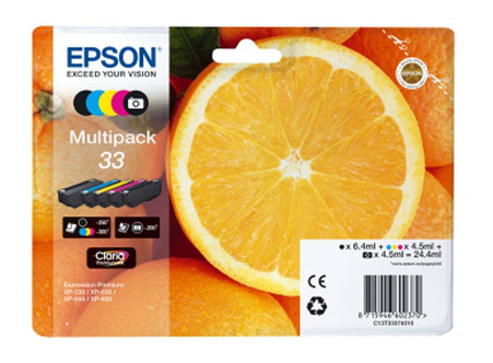 Originální inkousty Epson, sada symbol 33 / T3337, C13T33374010. Kapacita 250 stran černá, 300 stran barevná, 200 stran foto černá. Výrobek pochází z oficiální distribuce značky Epson. Balení obsahuje 5 tiskových jednotek v černé, modré, purpurové a žluté barvě.