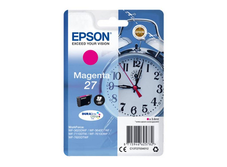 Originální inkoust Epson se symbolem 27 / T2703, C13T27034010. Výtěžnost 300 stran. Výrobek pochází z oficiální distribuce značky Epson. Balení obsahuje 1 kus tiskového náplně v purpurové barvě.
