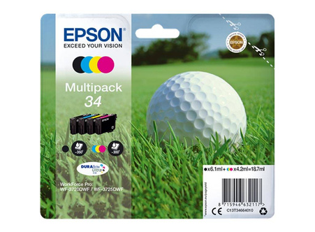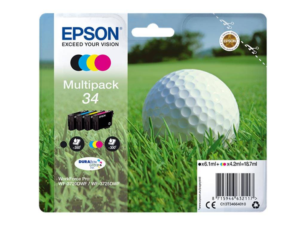 Originální inkousty Epson, sada se symbolem 34 / T3466, C13T34664010. Kapacita 350 stran černá, 300 stran barevná. Výrobek pochází z oficiální distribuce značky Epson. Balení obsahuje 4 tiskové jednotky v černé, modré, purpurové a žluté barvě.