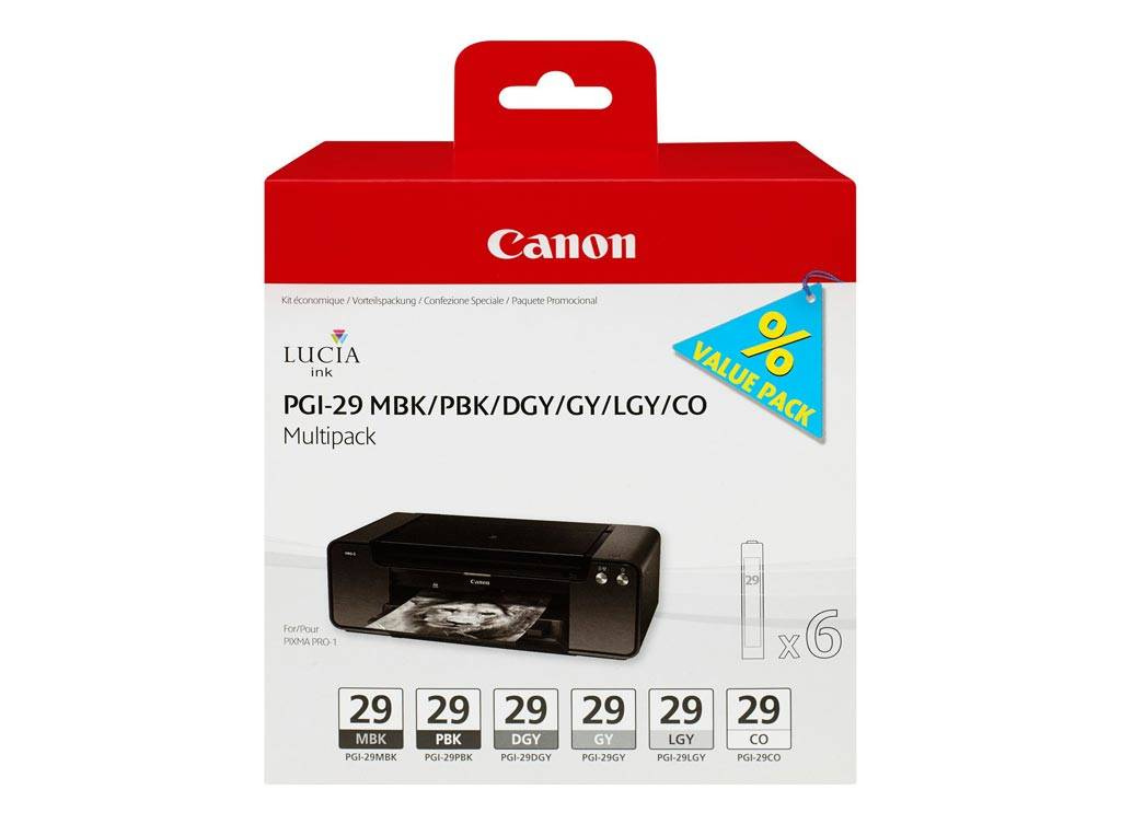 Originální inkousty Canon, sada se symbolem PGI-29 / 4868B018. Výtěžnost 1925 stran matné černé, 1300 stran fotografické černé, 710 stran tmavě šedé, 724 stran šedé, 1320 stran světle šedé. Výrobek z oficiální distribuce společnosti Canon. Balení obsahuje 6 tiskových jednotek v černé barvě, šedé barvě (různé odstíny).