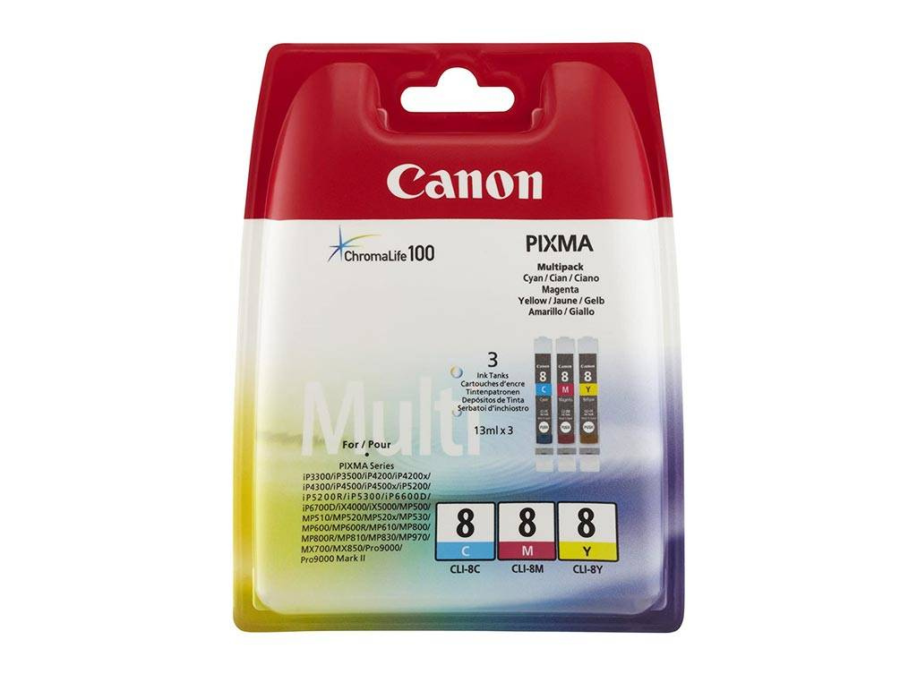 Originální inkoust Canon, trojbalení symbol CLI-8 / 0621B029. Výtěžnost 3x 420 stran. Výrobek pochází z oficiální distribuce značky Canon. Balení obsahuje 3 tiskové jednotky modré, purpurové a žluté barvy.