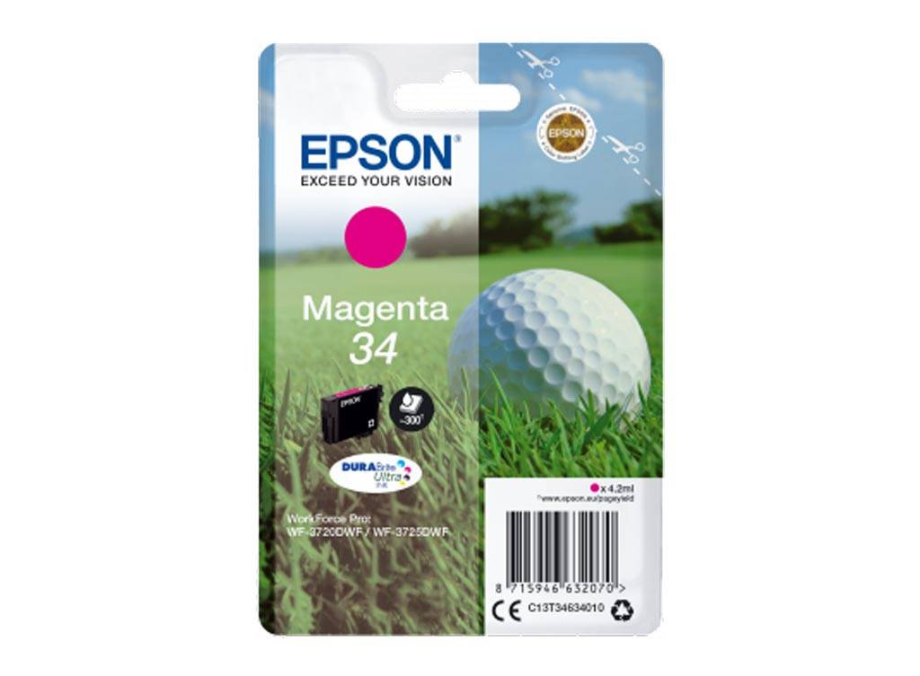 Originální inkoust Epson se symbolem 34 / T3463, C13T34634010. Výtěžnost 300 stran. Výrobek pochází z oficiální distribuce značky Epson. Balení obsahuje 1 kus tisku v purpurové barvě.