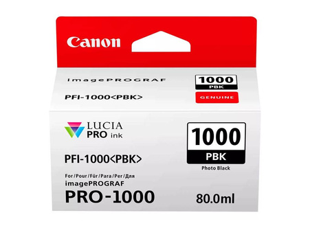 Originální inkoust Canon PFI-1000PBK / 0546C001. Výtěžnost 5490 stran. Produkt pochází z oficiální distribuce značky Canon. Balení obsahuje 1 kus tiskového stroje v černé barvě.