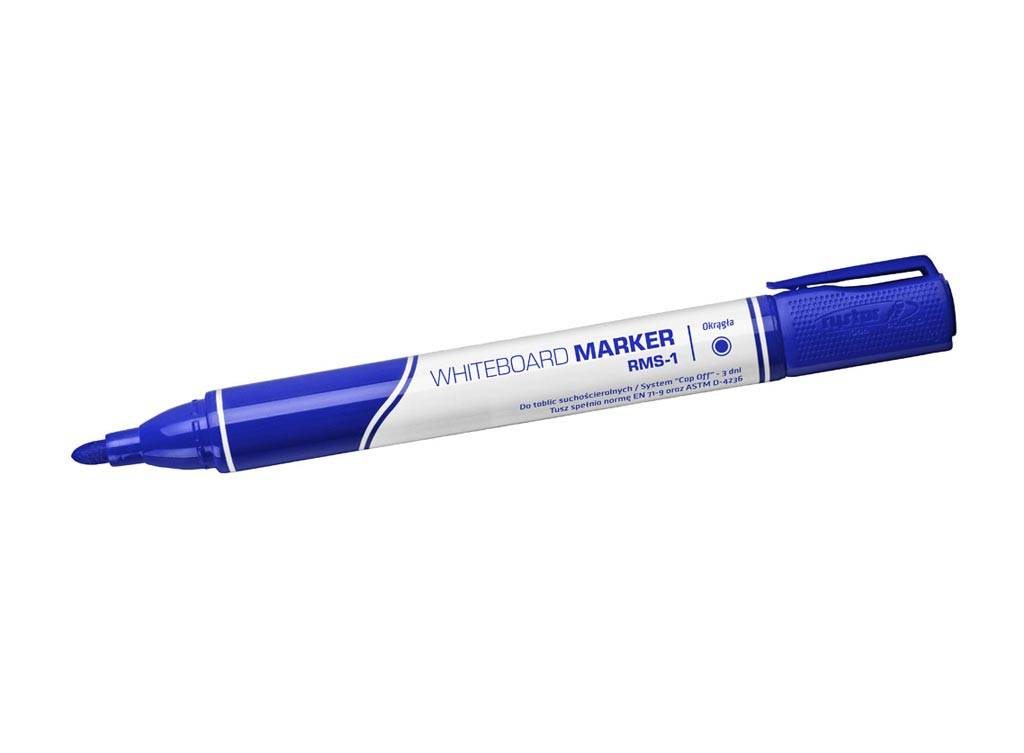 Suchý stíratelný popisovač Rystor, snadno stíratelný, intenzivní barvy, kulatý vláknový hrot, uzavírací systém 3 dny, inkoust odpovídá EN 71-9 a ASTM D-4236, tloušťka hrotu: 4 mm, vyrobeno v Polsku, modrá barva