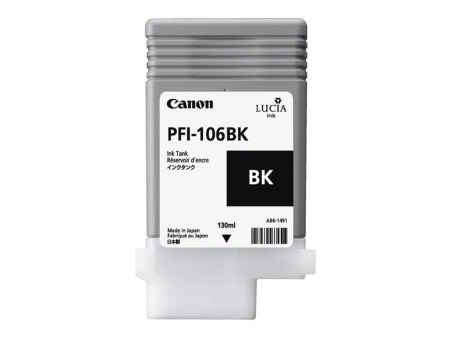 Originální inkoust Canon PFI-106BK / CF6621B001AA. Kapacita 130 mililitrů. Výrobek pochází z oficiální distribuce značky Canon. Balení obsahuje 1 kus tiskařské černé barvy.