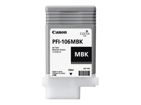 Originální inkoust Canon PFI-106MBK / CF6620B001AA. Kapacita 130 mililitrů. Výrobek pochází z oficiální distribuce značky Canon. Balení obsahuje 1 tiskový kus v matné černé barvě.