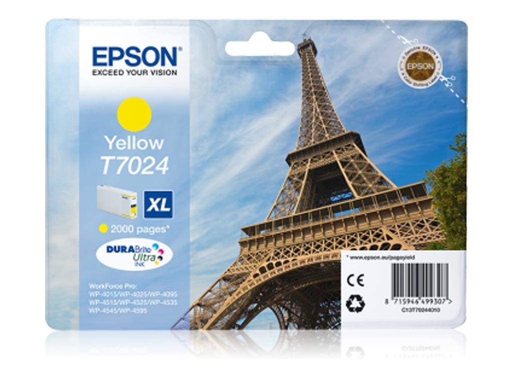 Originální inkoust Epson se symbolem T7024 XL / C13T70244010. Výtěžnost 2000 stran. Výrobek pochází z oficiální distribuce značky Epson. Balení obsahuje 1 kus tiskoviny ve žluté barvě.