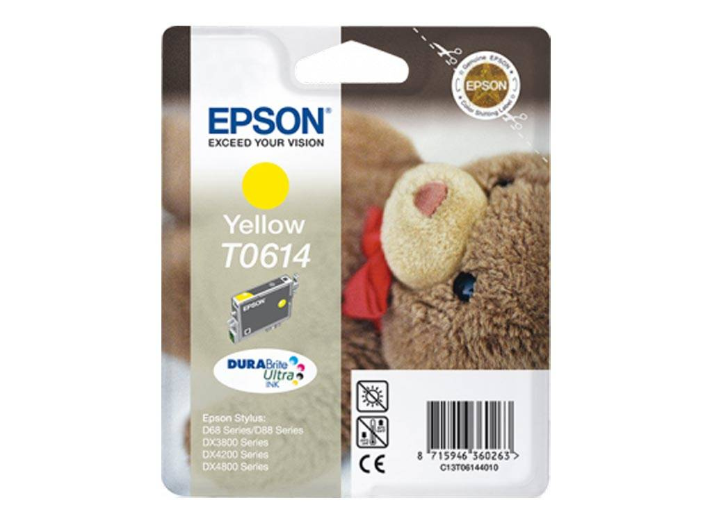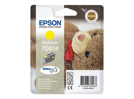 Originální inkoust Epson se symbolem T0614 / C13T06144010. Výtěžnost 250 stran. Výrobek pochází z oficiální distribuce značky Epson. Balení obsahuje 1 kus tiskoviny žluté barvy.