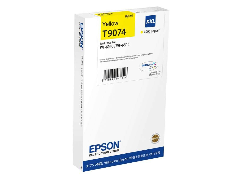 Originální inkoust Epson se symbolem T9074 XXL / C13T907440. Výtěžnost 7000 stran. Výrobek pochází z oficiální distribuce značky Epson. Balení obsahuje 1 kus tiskoviny ve žluté barvě.
