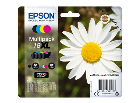 Originální inkousty Epson, sada se symbolem 18XL / T1816, C13T18164012. Výtěžnost 735 stran černé, 450 stran barevné. Výrobek pochází z oficiální distribuce značky Epson. Balení obsahuje 4 tiskové jednotky v černé, modré, purpurové a žluté barvě.