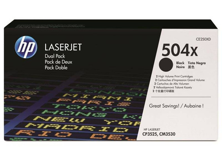 Originální toner HP, dvojbalení se symbolem 504X / CE250XD. Výtěžnost 21000 stran (2x 10500 stran). Produkt pochází z oficiální distribuce značky HP. Balení obsahuje 2 kusy s tiskem v černé barvě.